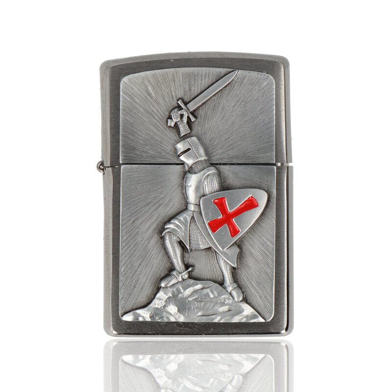 This Zippo lighter features a raised cast-metal Crusader design, complete with detailed armour, sword, and red cross accent. Built on a high-polish chrome case, it combines bold medieval styling with Zippo’s iconic windproof performance. Fully refillable and made in the USA, it includes Zippo’s lifetime guarantee for long-term reliability.