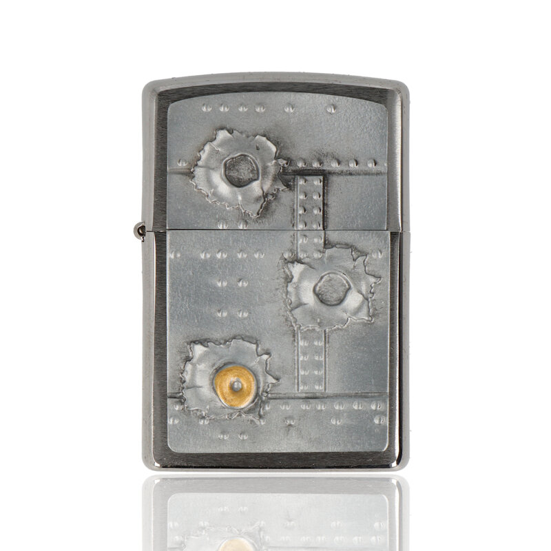 A polished Zippo lighter featuring a 3D relief steel-plate design with realistic bullet hole detailing. Durable, refillable, and windproof — made in the USA.