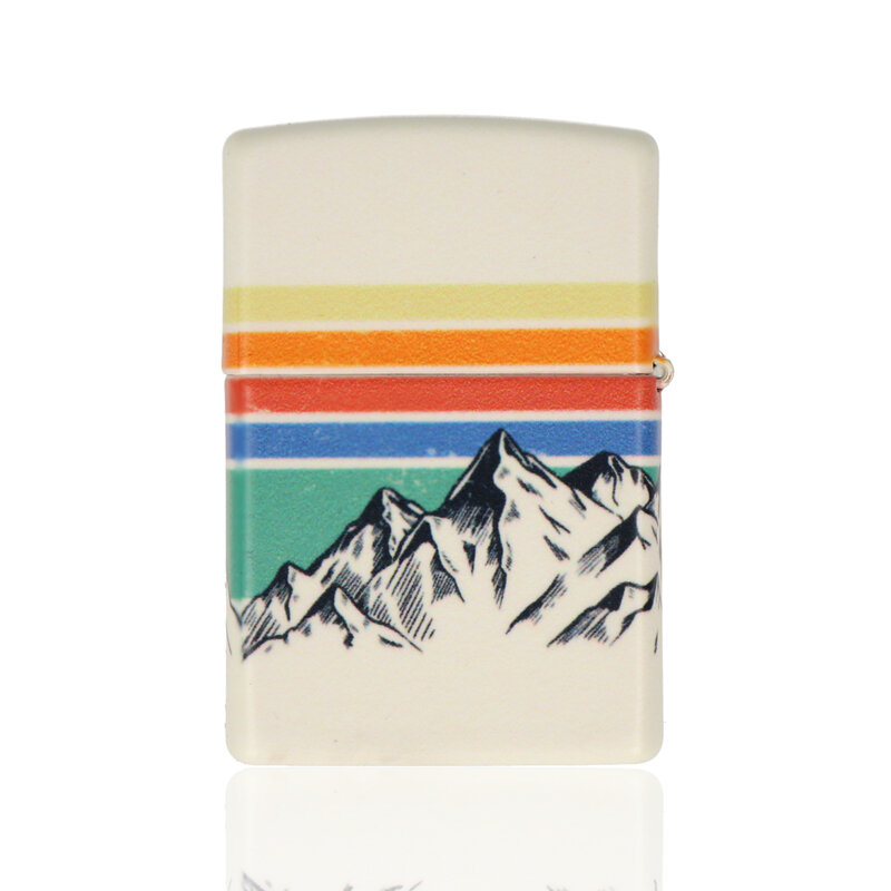 This lighter features a clean white matte finish with a stylised mountain illustration and retro multicolour stripes. Built on the classic windproof Zippo case, it offers reliable performance in all weather and is refillable with standard lighter fuel. Made in the USA and supported by Zippo’s lifetime guarantee, it combines outdoor-inspired artwork with everyday practicality.