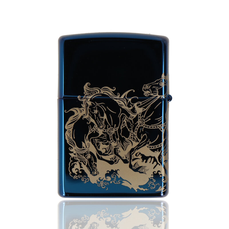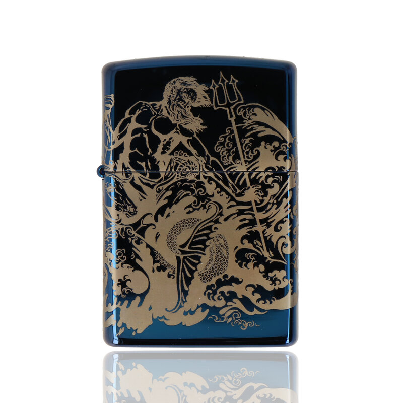The Zippo 48787 Atlantis Design Lighter features a high-polish blue finish with a full golden engraving depicting Poseidon and sea horses. Built on Zippo’s classic windproof case and flint ignition system, it combines reliable performance with a striking mythological theme. Made in the USA and backed by Zippo’s lifetime guarantee.