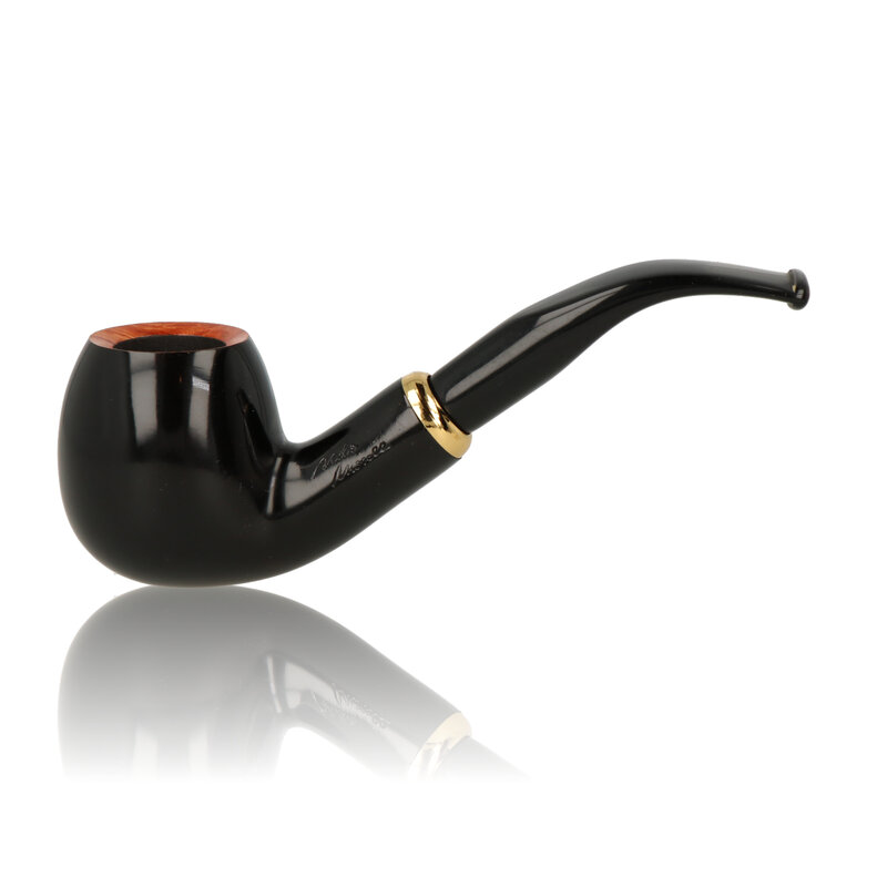 Aldo Morelli Fiorita The Aldo Morelli Fiorita is a stunning 9mm Briar pipe series with a high polished black bowl. They have chunky and robust tapered acrylic mouthpieces fitted with a contracting brass mount. The lip of the bowl is stained in a reddish brown to show off the natural grain of the briar, which adds a lovely character to the pipes. All in all a very striking design.