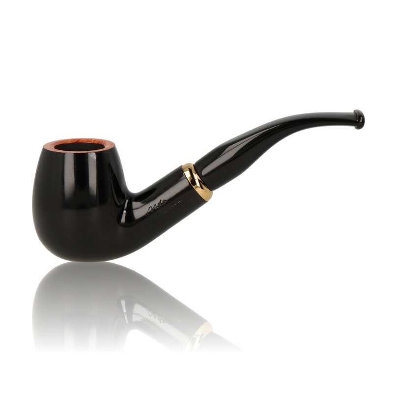 Aldo Morelli Fiorita The Aldo Morelli Fiorita is a stunning 9mm Briar pipe series with a high polished black bowl. They have chunky and robust tapered acrylic mouthpieces fitted with a contracting brass mount. The lip of the bowl is stained in a reddish brown to show off the natural grain of the briar, which adds a lovely character to the pipes. All in all a very striking design.