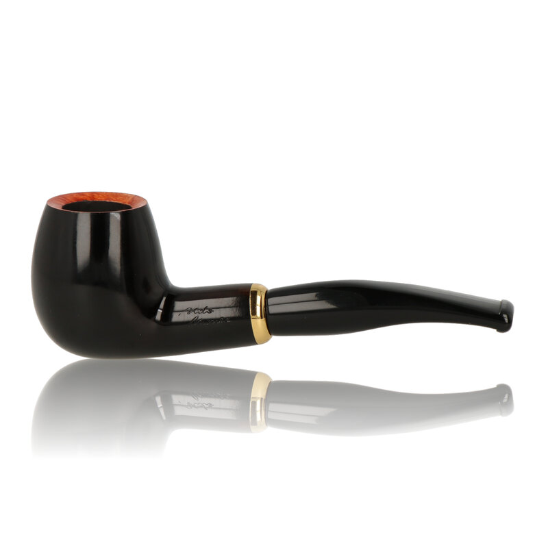 Aldo Morelli Italian Briar Smoking Pipes The Aldo Morelli Fiorita is a stunning 9mm Briar pipe series with a high polished black bowl. They have chunky and robust tapered acrylic mouthpieces fitted with a contracting brass mount. The lip of the bowl is stained in a reddish brown to show off the natural grain of the briar, which adds a lovely character to the pipes. All in all a very striking design.