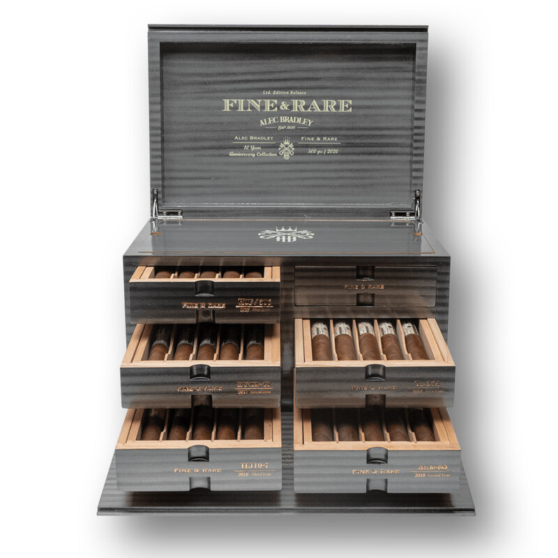 Alec Bradley 10 Year Anniversary Box Set To produce this 10-year anniversary box set, Alec Bradley have delved into their archives and selected a series of cigars from the Fine and Rare brand dating back to 2014. These cigars are not just recreations of the original blends but rather are cigars that were set aside each year from from the original production runs, and placed in an aging room specifically for this box set.