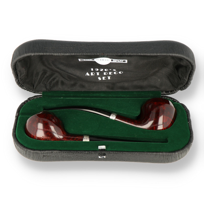 1920's Art Deco Pipe Set Art Deco is a style of design, architecture and art that first appeared in Paris just before the first world war. It was in the mid 1920's, when Art Deco had become the established design style, when Alfred Dunhill published the fifth edition of his comprehensive product catalogue About Smoking - An Encyclopedia of Smoking containing a variety of products, both pipes and accessories, designed in the prevalent Art Deco style. This is where the pipe shapes from this set have been re-discovered. The shapes are extremely elegant, perfectly embodying the style. Both shapes have not been manufactured for at least 30 years.