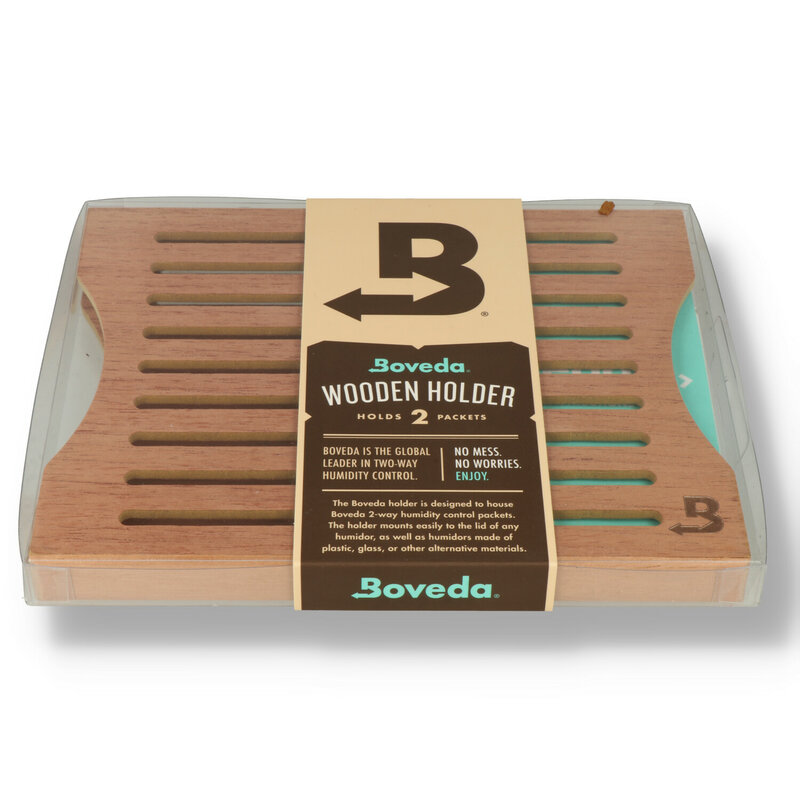 Boveda Wooden Packet Holder For use with 2x 60g Boveda Humidity packs. The wooden holder mounts to the lid of any humidor with a magnetic, or velcro fastening (both included).