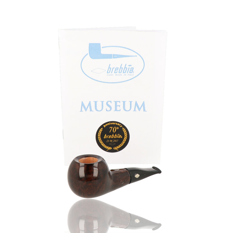 Pipa 70 Rocciata Noce The 70th Anniversary pipe from Brebbia commemorates the company's founding in 1947. This chubby, fat-shanked Tomato, made in limited numbers for 2017 only is a wonderfully chunky pipe with a substantial thick walled sandblasted bowl is sure to give a cool smoking experience. Finished with a tapered push tenon black acrylic stem and accented with a metal 70 logo on the shank.