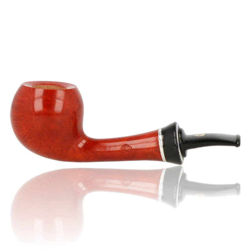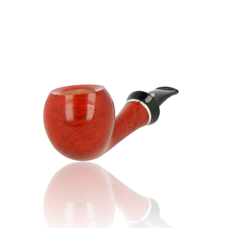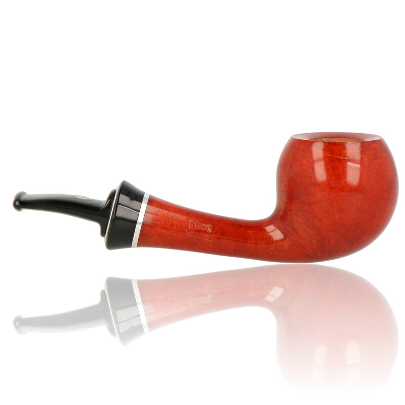 Pipa Lucy This shape is a beautiful apple shaped bowl with stunning design lines, the long shank opens out to the 9mm filtered stem, as unusual a shape it is it sits very well in the hand and offers a good depth of chamber. The deep red stained bowl is finished with a deep black chrome rimmed stem and the MPB accenting and stainless steel band.
