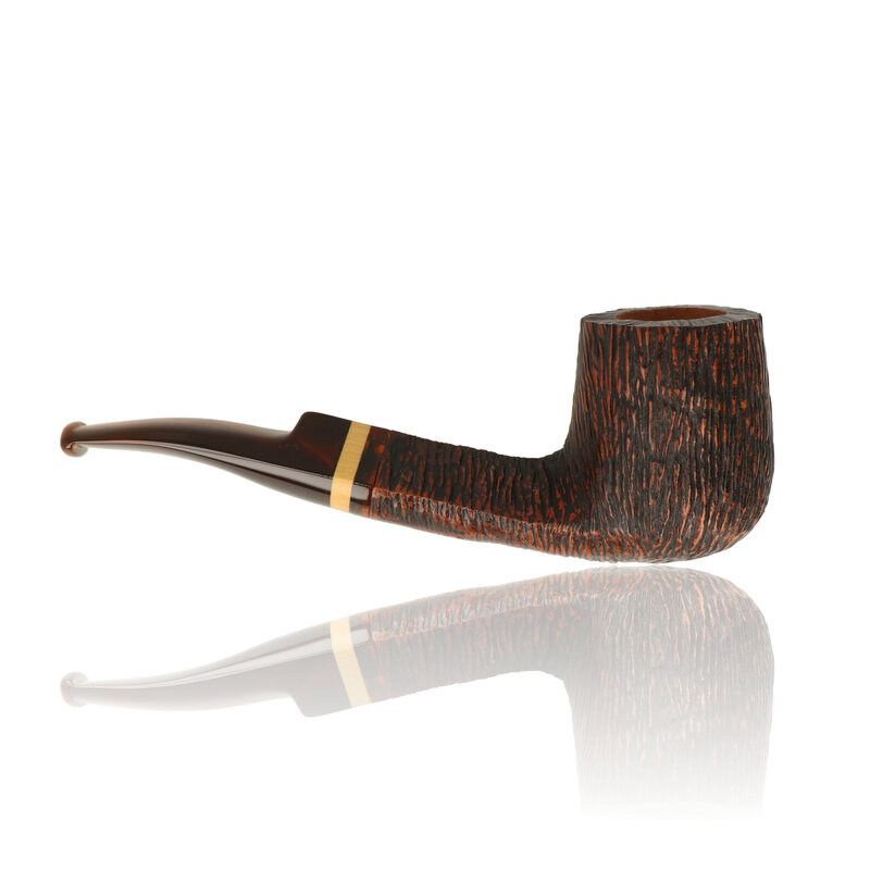 This shape is Brebbia's bold take on the Classic Billiard, with a slight curv and a half-squared shank. The unique rusticated finish gives more surface area to give a cooler smoke. Finished with a deep amber coloured cumberland style stem and an accenting two tone wooden band.