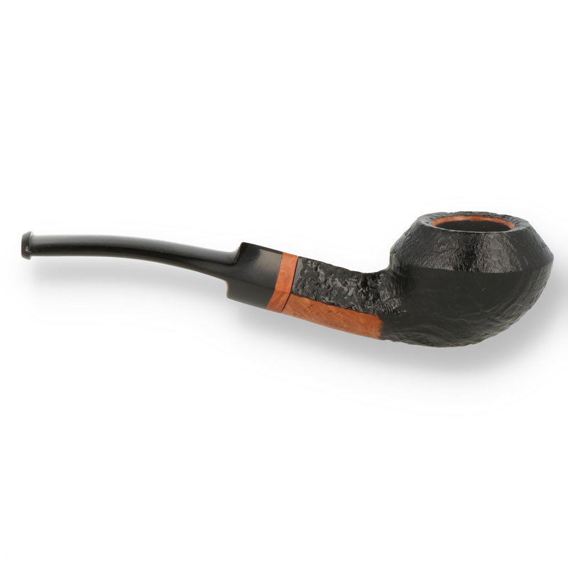 1960 Series One of Brebbias less frequently seen designs, the 623 is a neat little 3-quarter bent Rhulldog presented in a high gloss jet black sandblast, The difference between a Rhodesian and a Bulldog has been a matter for discussion in the pipe world since their inception. As a general rule of thumb, if the height of the bowl is greater than the width it is a Bulldog, otherwise it is a Rhodesian, If it has a round Shaft it is a Rhodesian or a square shaft it is a Bulldog, Some say if it has a straight shaft it is a Bulldog, If it is bent it is a Rhodesian, therefore this is a Rhulldog (or a Bhodesian, we couldn't decide) It has been finished with a black acrylic saddle tenon stem accented with a light stain briar band. This classic style is a perfect size for a hands free jacket pocket pipe.