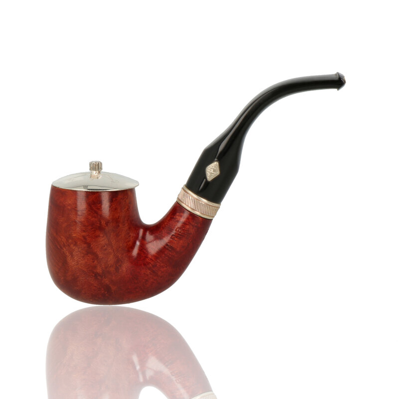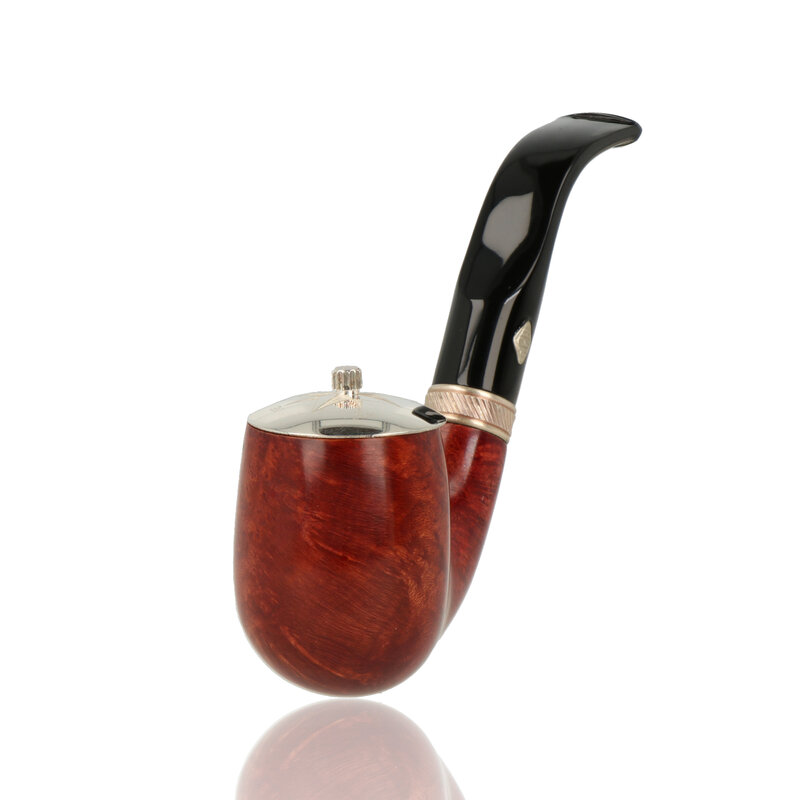 Sailing Amaranto While the proportions of the "6006" Full Bent Billiard aren't far off from English territory, the lines are definitely Italian in nature, specifically around the lower bowl and heel. Fitting to this neo-classic approach to the shape, this example comes in the dark finish and silver band of the MPB Sailing series, which, aside from the slashing pattern running along the center of the band, is itself quite old-school in nature. Comes with a compass engraved solid sterling silver cap in a presentation box.