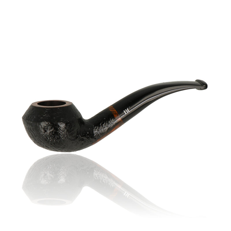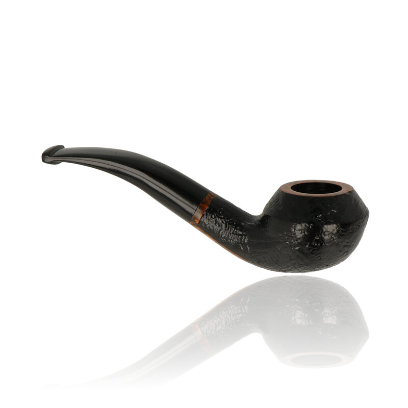 Sablee is French for sandblasted and the pipe is stained black, with a smooth, reddish-brown finish on the rim and edge of the shank.