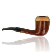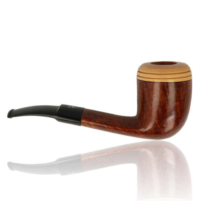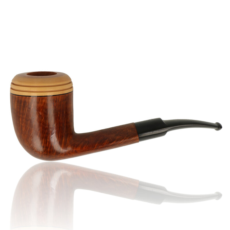 The Butz-Choquin Straight Grain 107 is a bent billiard pipe featuring a smooth chestnut finish and contrasting natural maple rim with twin decorative rings. Fitted with a black acrylic fishtail stem and 9mm filter. Handcrafted in Saint-Claude, France.