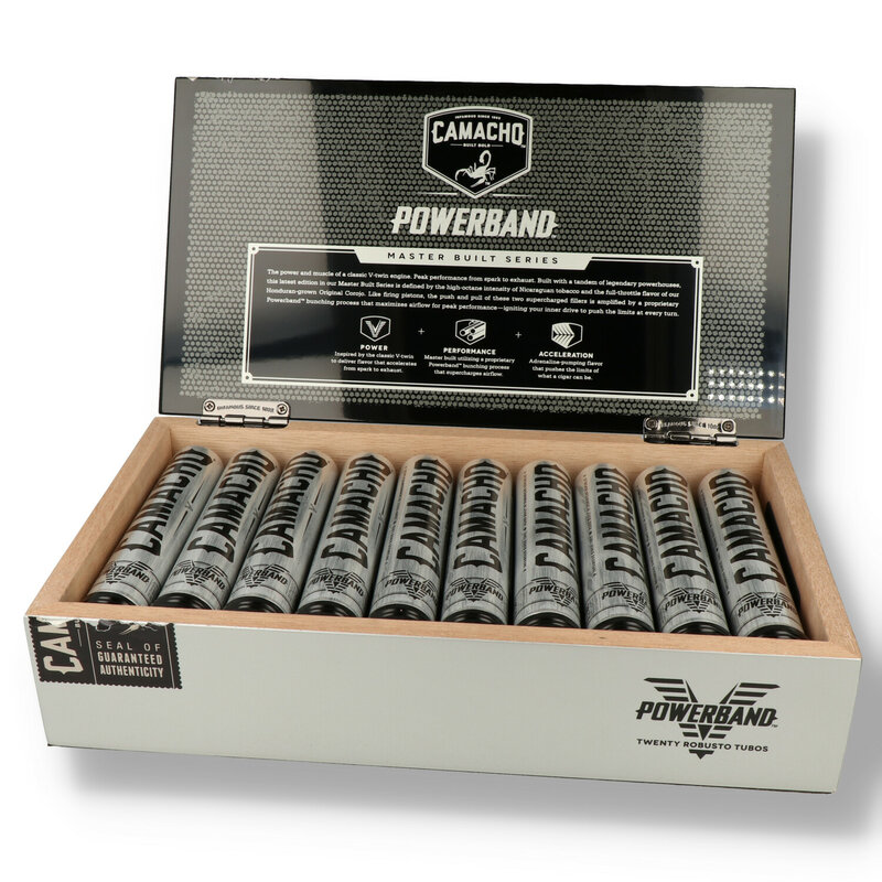 Camacho Powerband: The Camacho Powerband is an offering from the Camachos Master Built Series and brings a unique American barrel aged and triple Maduro paired with a powerhouse blend of Honduran Corojo Ligero, Nicaraguan Estelí Ligero, Dominican San Vicente Ligero, San Vicente Viso and Dominican Piloto Cubano all wrapped in a deep brown Ecuadorian Habano wrapper. The results deliver a full pedal to the metal flavoured smoke that offers up rich flavours of coffee, cedar and peppery spice with a hint of sweetness.