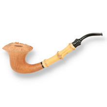 Chacom Bamboo Special Freehand Chacom are not widely known for their freehand pipes but quite predictably for a company of it’s heritage and experience it is something they excel at. Every now and then the pipe graders come across an exceptional block of Briar and feel that it should be made into something much more special than the general shape range that makes up 95% of their production. So on special days the carvers are given free reign to let their creative juices loose! This Special Bamboo is quite frankly impeccable. The natural stain perfectly accentuates the perfect flame grain running up the bowl, the rim has been left sandblasted to show the end grain or birdseye. The pipe is then finished with a bamboo stem and black saddle mouthpiece.