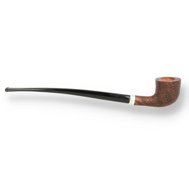 Chacom Ideal Sablee F4 An elegant briar pipe with a Zulu-shaped bowl, The sandblasted matte brown finish really accentuates the grain. The pipe comes with a choice of two stems to give you the best of both worlds, A longer stem to turn it into a churchwarden or a regular length stem for when you are on the go. An elegant chrome band on the shank just perfectly finishes off the look of this pipe. The Ideal takes a 9mm filter and also comes with a stinger and adapter to allow you to choose your smoking preference.