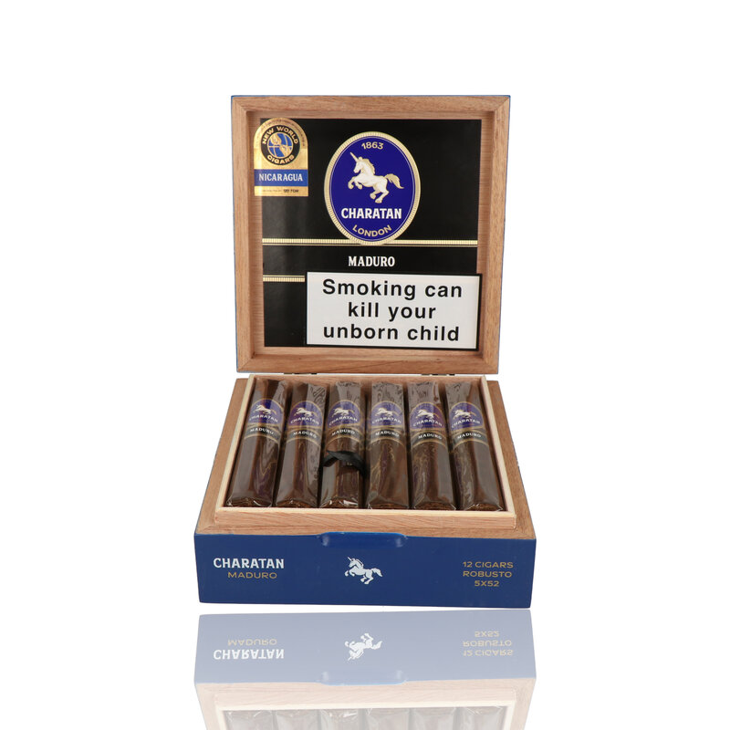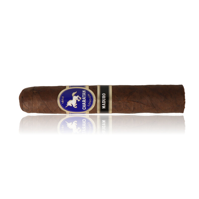 The Charatan London Maduro Robusto is a 5x50 medium to full-bodied cigar. With a Nicaraguan maduro wrapper, it delivers cocoa, dark wood, and spice. Sold packaged in a box of 12 Cigars