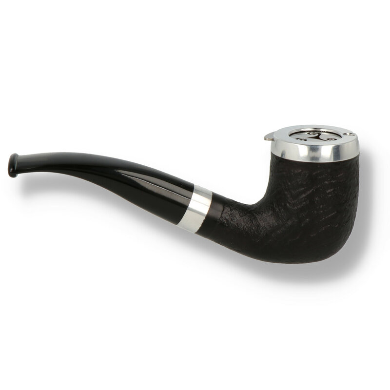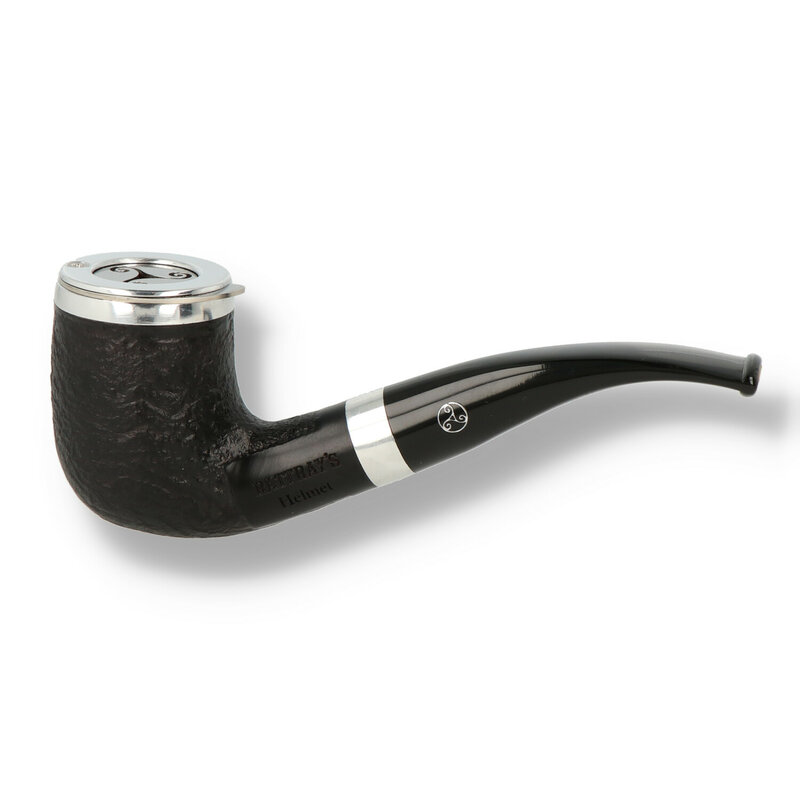 Charles Rattray's Helmet Briar Pipe 137 Designed with the outdoor smoker in mind these Rattray's Helmet Briars are perfect for fishing, golfing, shooting, or anywhere where you are exposed to the elements but still desire a quick puff. The built in slidable cover with the Rattray's logo is designed to keep the wind out and the tobacco in whatever the weather. The 137 is a curved Billiard with a black sandblast finish, the lid is complemented by a chrome band transition between the shank and stem.