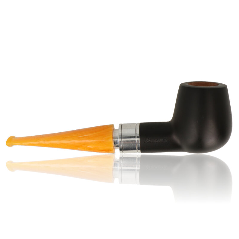 The matte black finish is understated yet elegant, offering a subtle sheen without the overpowering gloss of a glossy finish. It accentuates the pipe’s intricate geometry, allowing the vibrant yellow acrylic stem to take centre stage. Complementing the stem with a subtle nickel mount, the result is a quietly striking piece—not flashy, but certainly not shy.