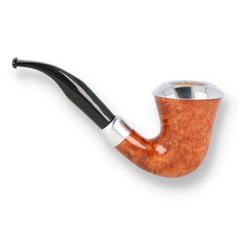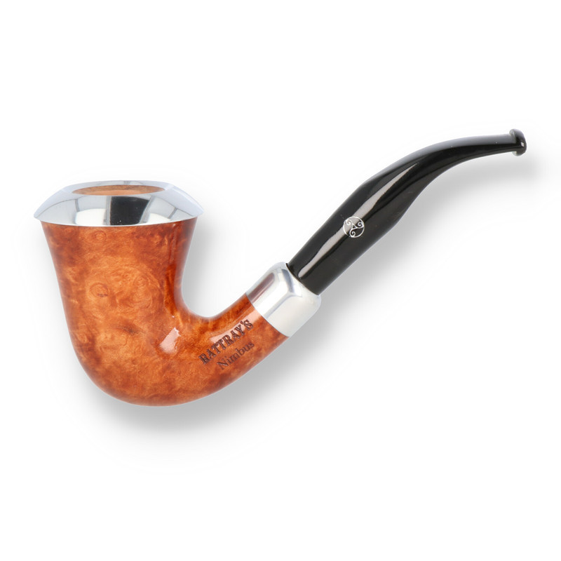 Charles Rattray's Nimbus Briar Pipes The striking feature of the Charles Rattray's Nimbus is the Solid metal halo around the rim of the bowl. Not only does this protect the rim from scorching but it dissipates the heat from the bowl providing a cooler smoke, In a classic Calabash shape with a striking design the nimbus is finished with a 9mm half bent stem that sits snugly in the matching metal band and Rattrays logo imprinted on the shank.