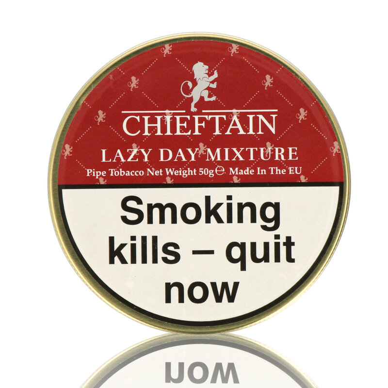 Chieftain Lazy Day Mixture Pipe Tobacco The Lazy Day is a mild aromatic blend comprised of a mixture of Virginia, Carolina Burley and a generous helping of Cavendish which give a wonderfully rounded true tobacco taste that have then been topped with sweet Mango, Exotic Citrus and Vanilla flavourings. The sweetness is intense and the flavours stay throughout the bowl just a perfect everyday blend for the aromatic fans. A guilty pleasure that many of us strive for.