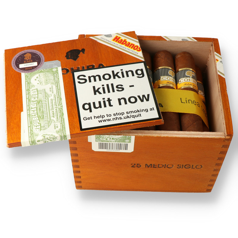 The Cohiba Medio Siglo cigar was introduced as part of Cohiba's 50th anniversary celebrations, it is one of the smallest in the range and is perfect for smoking at almost anytime, with morning coffee or after a light lunch. It has flavours of wood, spice and a slight hint of caramel. The finest introduction to premium cigars or a taste quenching start to an evening.