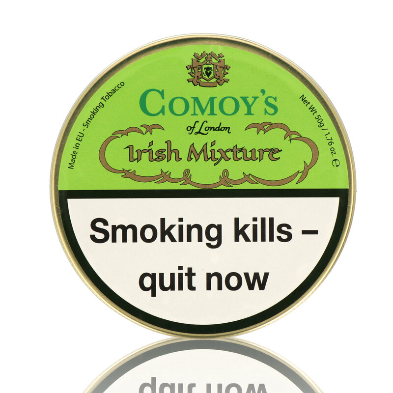 Comoy's Irish Mixture Pipe Tobacco: The Comoy's Irish mixture is created using naturally sweet broken Virginia tobaccos with a good portion of Black Cavendish to create a very smooth and naturally sweet blend. The blend has no additional flavours or casing as all traditional english blends should be! Let the blend sing for itself and let the natural Tobacco flavours melt on your palate!