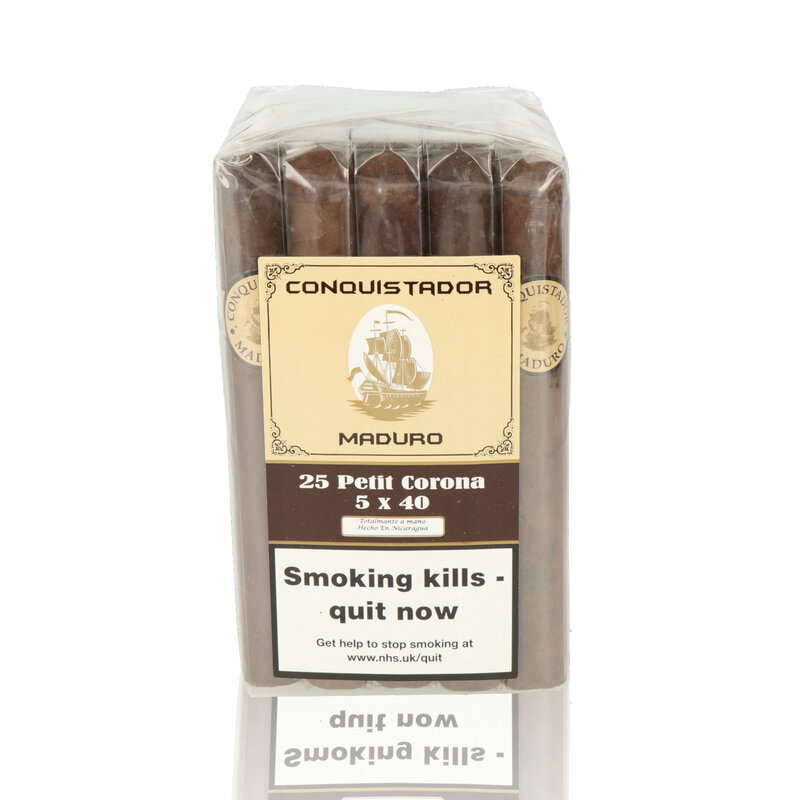 Conquistador Maduro Petit Corona Featuring a 5/40 Petit Corona. The Petit Corona is bursting with flavour, bundles of cocoa, coffee with a slight peppery sweetness. We are seriously impressed with these budget cigars, they provide a stunning smoking experience for a very reasonable price tag.
