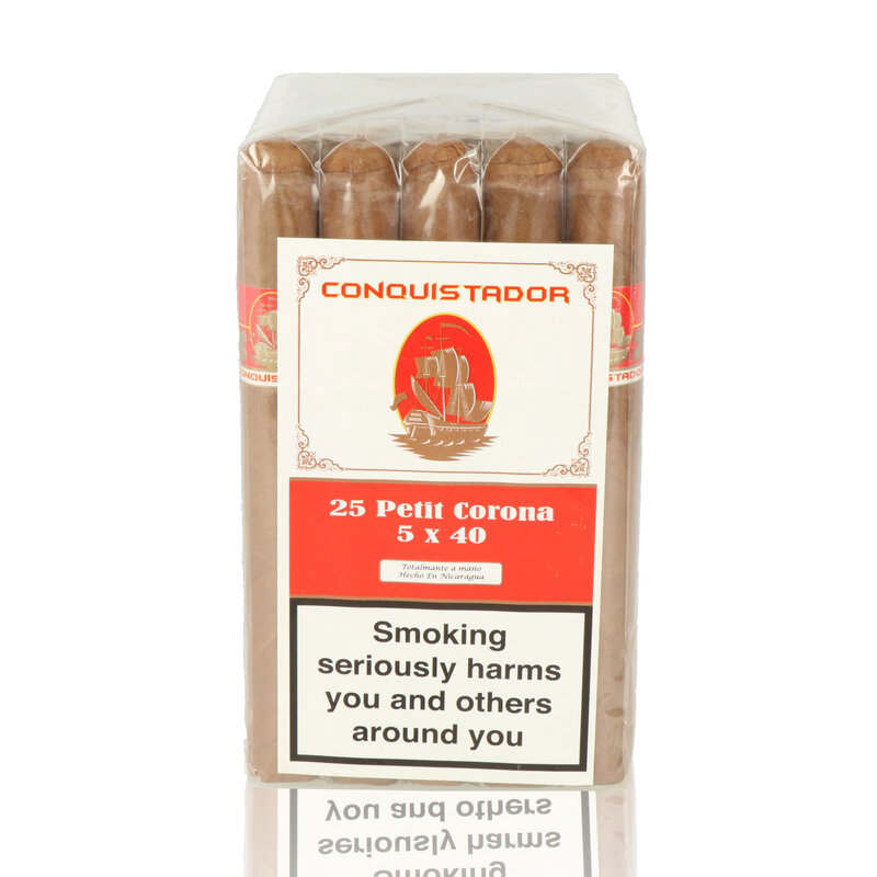 Conquistador Short Robusto Featuring a 5/40 Petit Corona Vitola. The Petit Corona is bursting with flavour, bundles of woody and creamy notes with a slight fruity sweetness. We are seriously impressed with these budget cigars, they provide a stunning smoking experience for a very reasonable price tag.