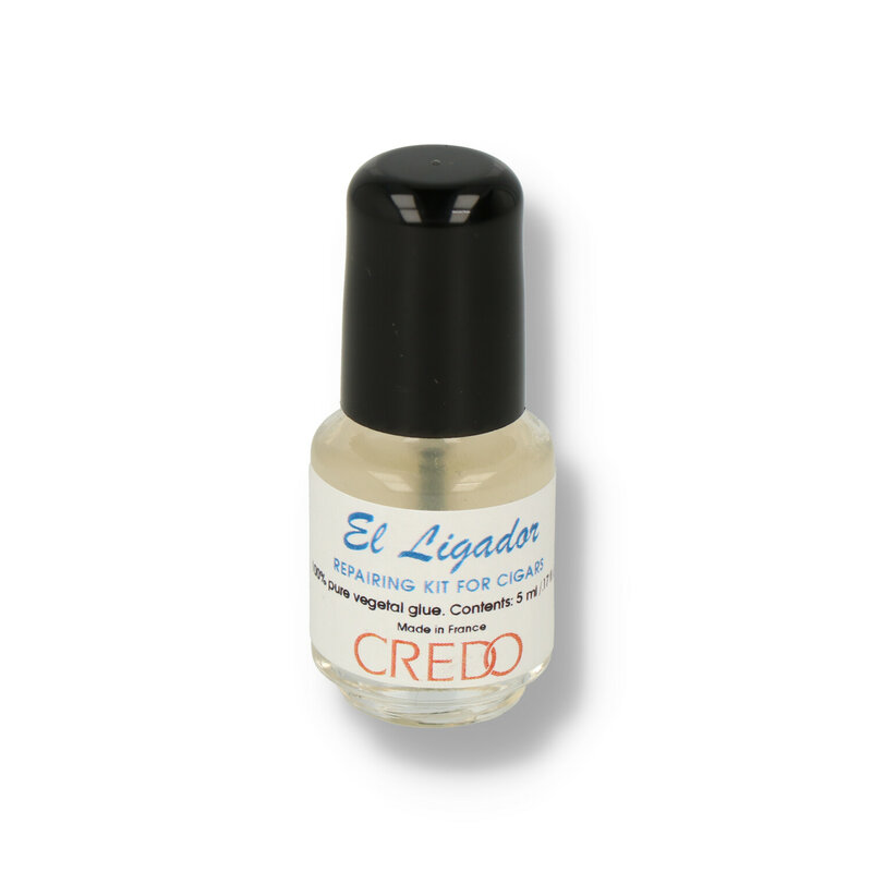 Credo El Ligador is a cigar repair glue and sealer product meant to glue down any lifting or unraveling cigar wrapper instantly and securely. It will also seal any crack, hole or lifted edge of the wrapper causing minor and even major air leaks through the sides of a cigar instantly. The compact bottle is designed to fit easily into a pocket or in any cigar tool kit. Each bottle is good for approximately 80 typical cigar repairs.