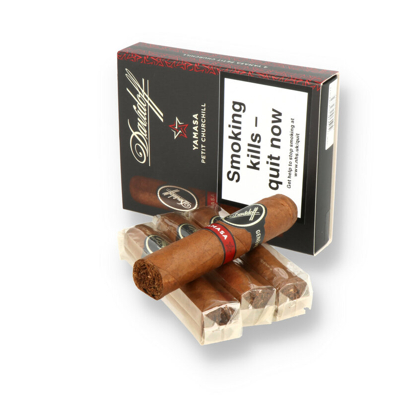 Davidoff Yamasa Petit Churchill: The Davidoff Yamasa series combines tobacco from Nicaragua and the Yamasa region of the Dominican Republic. The Davidoff Yamasa has been decades in the making. Once regarded as an unforgiving swampland, the Yamasa region was successfully turned into a tobacco growing field by Master Blender Henke Kelner on an endless pursuit to bring new tastes and experiences to the cigar world. Discovering that the soil contained too much loam and was too sandy to allow anything to grow, they added nitrate and calcium to each tobacco plant by hand. Thanks to his determination and persistence the Yamasa is now producing some of the best tobaccos the Dominican has to offer. The Earthiness from the Yamasa tobaccos paired with the sweetness from the Esteli and Piloto tobaccos make these Petit Churchill a truly remarkable smoke with inspiring flavours of nut, melted with spice, coffee, cedarwood and earthy black pepper notes.