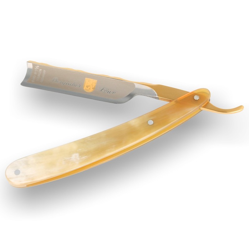 Dovo 3-580 Straight Razor: The Dovo Solingen 3-580 is one of the top Razors from the Dovo portfolio with probably the most stunning blade to be seen on a modern razor with a traditional Spanish point and sculptured spine. The blade is mirror polished with the Bergischer Lowe logo and 24k Gold etchings on the spine. The handle is made from real Buffalo horn which varies substantially from Razor to Razor from light to Dark browns with semi transparent areas on some pieces.