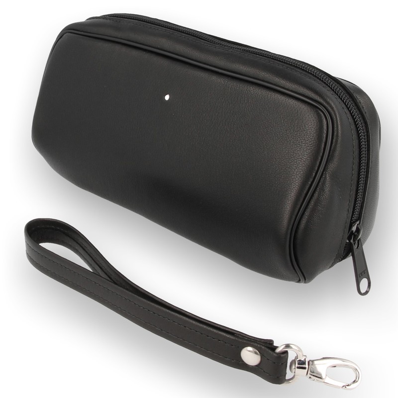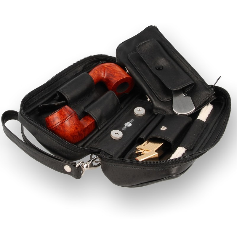 Alfred Dunhill Whitespot Leather Tobacco Pouch PA2018: The Alfred Dunhill White Spot Gentleman's Companion is probably one of the finest Tobacco Pouches available. It is the ultimate solution for any smoker who appreciates luxurious leatherware. To begin the shape of this pouch is far nicer than any other compendium style pouch we have seen. It is cleverly rounded to make it more pleasing to the eye and comfortable to hold yet doesn't impede on the capacity. The Tobacco storage pouch is a simple and neat zipped pouch that is completely removable and is secured using two magnetic fasteners on the base. There is a handy press stud compartment on the side of the tobacco pouch so this pouch can be used on it's own for short journeys when you don't need your full array of smokers accessories. The pouch is designed for easy access as one side opens up wider with a cleverly designed flap that only reveals itself when the pouch is unzipped. One one side of the Companion there is space for two pipes of average size which are held in place by two leather straps. There are two cleverly placed tensioners inside each loop to help secure the pipes further. On the other side of the companion there is a press stud compartment designed to hold a lighter in the region of 30mmx70mmx10mm. As you would expect this is the perfect size for a Dunhill Rollagas or Dunhill Unique lighter. There are also two loops designed for a pipe tool and pipe cleaners. And finally there is a removable leather strap. As with all the whitespot range the pouch is finished with an embedded white ball on the outside and a Gold embossed white spot logo discreetly placed under the tobacco pouch.