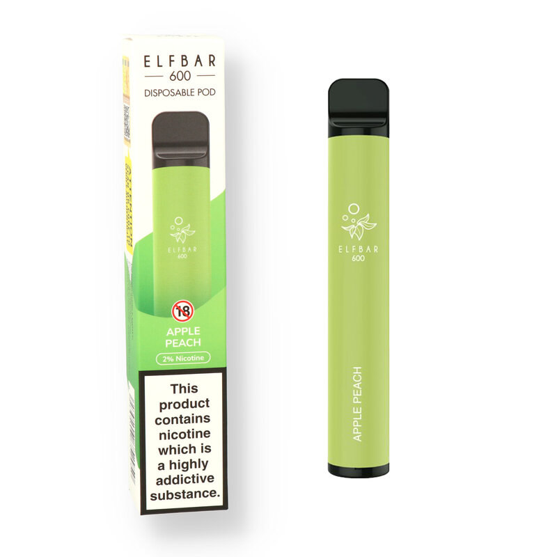 Elf Bars The Elf bars have taken the vaping world by storm due to their incredibly easy to use format. No more fiddling with messy eliquids and coils, just open the pack, remove the silicone covers on the top and bottom and start vaping, once it is finished just throw it away! It's small format does not sacrifice on performance, the 550mAh battery provides you with up to 600 puffs which is the equivalent of 50 cigarettes! Available in a plethora of flavours to suit any palette from creamy tobaccos to sweet and fruity and fresh minty menthols. And the smart heating method gives a much more natural taste compared to most other leading brands. The Apple Peach is fresh crisp apples and juicy ripe peaches