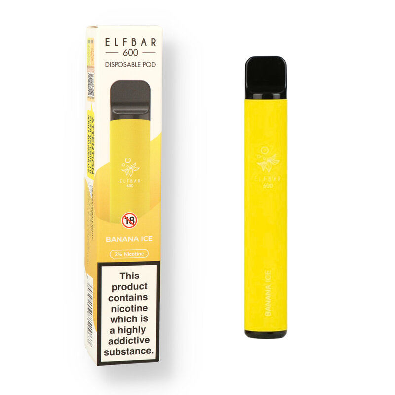 Elf Bars The Elf bars have taken the vaping world by storm due to their incredibly easy to use format. No more fiddling with messy eliquids and coils, just open the pack, remove the silicone covers on the top and bottom and start vaping, once it is finished just throw it away! It's small format does not sacrifice on performance, the 550mAh battery provides you with up to 600 puffs which is the equivalent of 50 cigarettes! Available in a plethora of flavours to suit any palette from creamy tobaccos to sweet and fruity and fresh minty menthols. And the smart heating method gives a much more natural taste compared to most other leading brands. The Banana Ice takes ripe Bananas and pairs with a cooling ice effect.