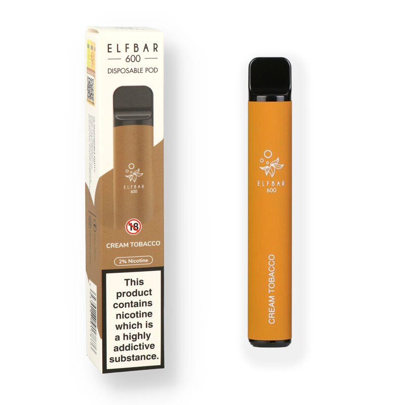 Elf Bars The Elf bars have taken the vaping world by storm due to their incredibly easy to use format. No more fiddling with messy eliquids and coils, just open the pack, remove the silicone covers on the top and bottom and start vaping, once it is finished just throw it away! It's small format does not sacrifice on performance, the 550mAh battery provides you with up to 600 puffs which is the equivalent of 50 cigarettes! Available in a plethora of flavours to suit any palette from creamy tobaccos to sweet and fruity and fresh minty menthols. And the smart heating method gives a much more natural taste compared to most other leading brands. The Cream Tobacco is a heady mix of Sweet Cream and Woody Tobaccos.