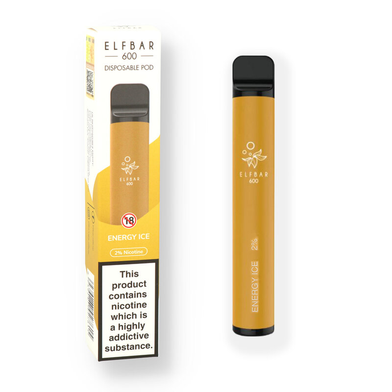 Elf Bars The Elf bars have taken the vaping world by storm due to their incredibly easy to use format. No more fiddling with messy eliquids and coils, just open the pack, remove the silicone covers on the top and bottom and start vaping, once it is finished just throw it away! It's small format does not sacrifice on performance, the 550mAh battery provides you with up to 600 puffs which is the equivalent of 50 cigarettes! Available in a plethora of flavours to suit any palette from creamy tobaccos to sweet and fruity and fresh minty menthols. And the smart heating method gives a much more natural taste compared to most other leading brands. The Energy Ice is an uplifting flavour of energy drink with a cooling hit of menthol