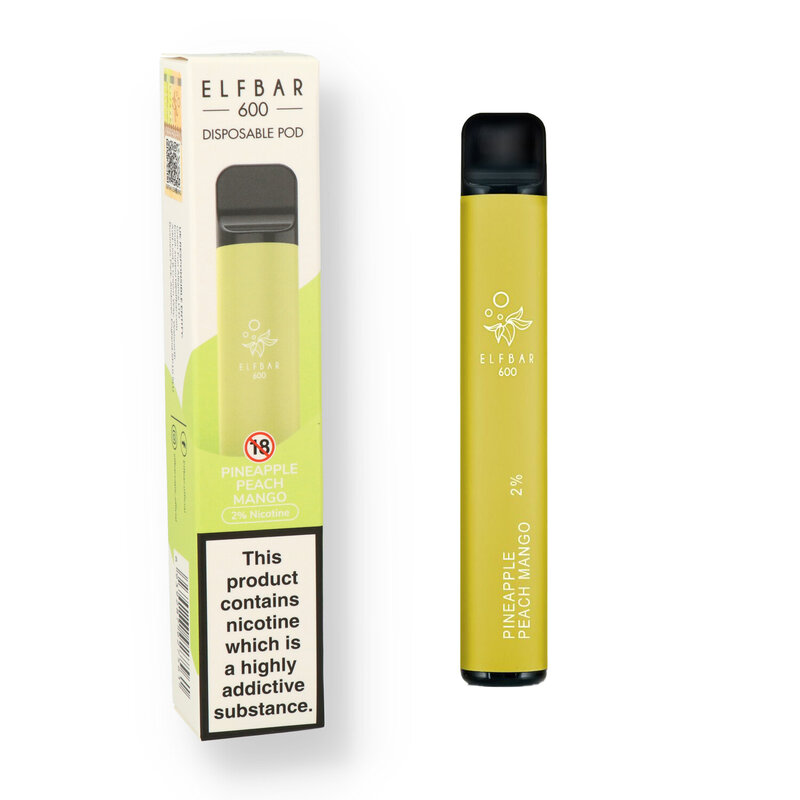 Elf Bars The Elf bars have taken the vaping world by storm due to their incredibly easy to use format. No more fiddling with messy eliquids and coils, just open the pack, remove the silicone covers on the top and bottom and start vaping, once it is finished just throw it away! It's small format does not sacrifice on performance, the 550mAh battery provides you with up to 600 puffs which is the equivalent of 50 cigarettes! Available in a plethora of flavours to suit any palette from creamy tobaccos to sweet and fruity and fresh minty menthols. And the smart heating method gives a much more natural taste compared to most other leading brands. The Pineapple Peach Mango is a fruity tropical blend of Pineapple Peach and Mangos