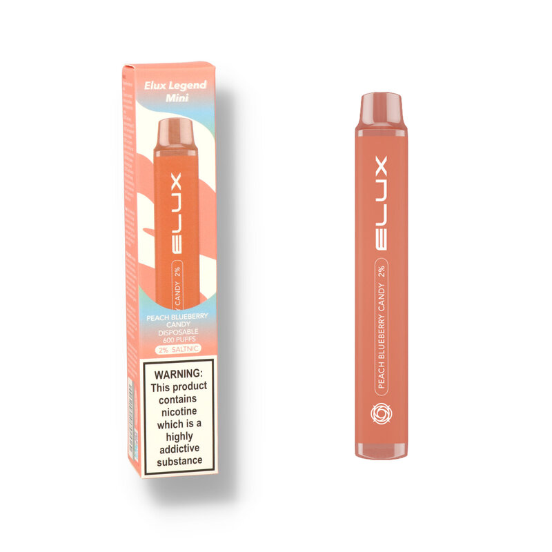 Elux Legend Mini Disposable Vapes have been taking the vaping world by storm due to their incredibly easy to use format. No more fiddling with messy eliquids and coils, just open the pack, remove the silicone covers on the top and bottom and start vaping, once it is finished just throw it away! It's small format does not sacrifice on performance, the 500mAh battery provides you with up to 600 puffs which is the equivalent of 50 cigarettes! Available in a plethora of flavours to suit any palette from creamy tobaccos to sweet and fruity and fresh minty menthols. And the smart heating method gives a much more natural taste compared to most other leading brands. The Peach Blueberry Candy is a mixture of sweet peaches, even sweeter blueberries and a hit of candy to satisfy that sweet tooth.