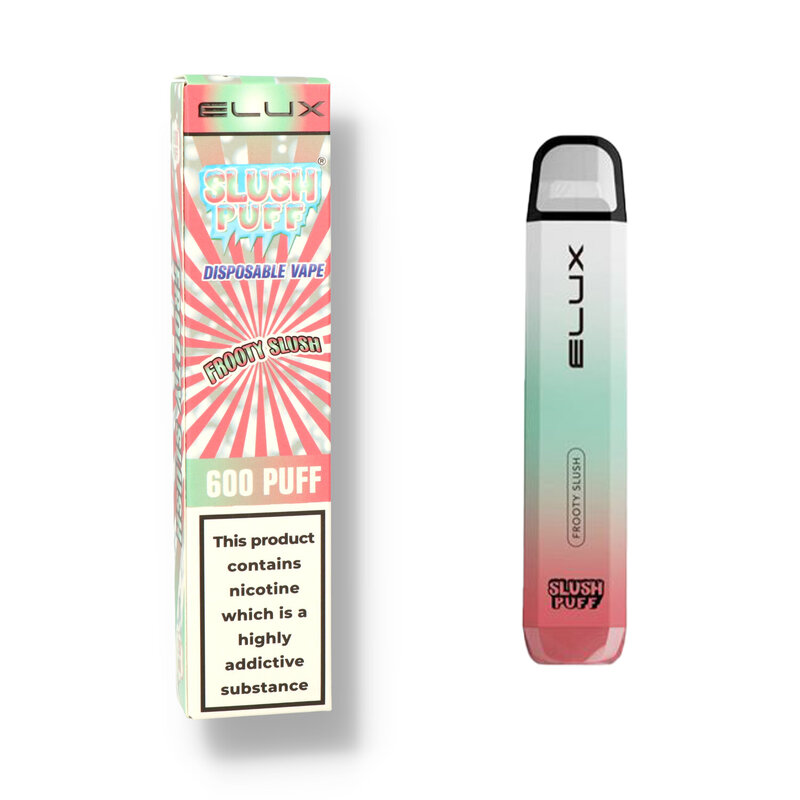 Elux Slush Puff Disposable Vapes have been taking the vaping world by storm due to their incredibly easy to use format. No more fiddling with messy eliquids and coils, just open the pack, remove the silicone covers on the top and bottom and start vaping, once it is finished just throw it away! It's small format does not sacrifice on performance, the 500mAh battery provides you with up to 600 puffs which is the equivalent of 50 cigarettes! Available in a plethora of flavours to suit any palette from creamy tobaccos to sweet and fruity and fresh minty menthols. And the smart heating method gives a much more natural taste compared to most other leading brands. The Frooty Slush is a combination of fruit flavours with an icy slush kick