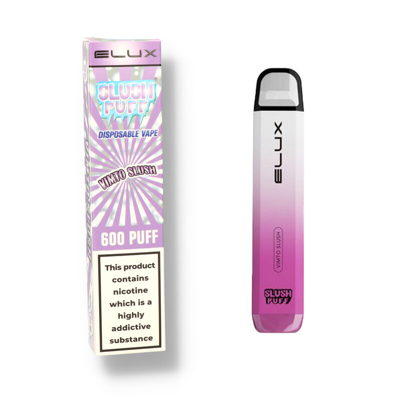 Elux Slush Puff Disposable Vapes have been taking the vaping world by storm due to their incredibly easy to use format. No more fiddling with messy eliquids and coils, just open the pack, remove the silicone covers on the top and bottom and start vaping, once it is finished just throw it away! It's small format does not sacrifice on performance, the 500mAh battery provides you with up to 600 puffs which is the equivalent of 50 cigarettes! Available in a plethora of flavours to suit any palette from creamy tobaccos to sweet and fruity and fresh minty menthols. And the smart heating method gives a much more natural taste compared to most other leading brands. The Vimto Slush is a fruity blend of blackcurrants, crisp apples and juicy grapes with an extra icy blast kick
