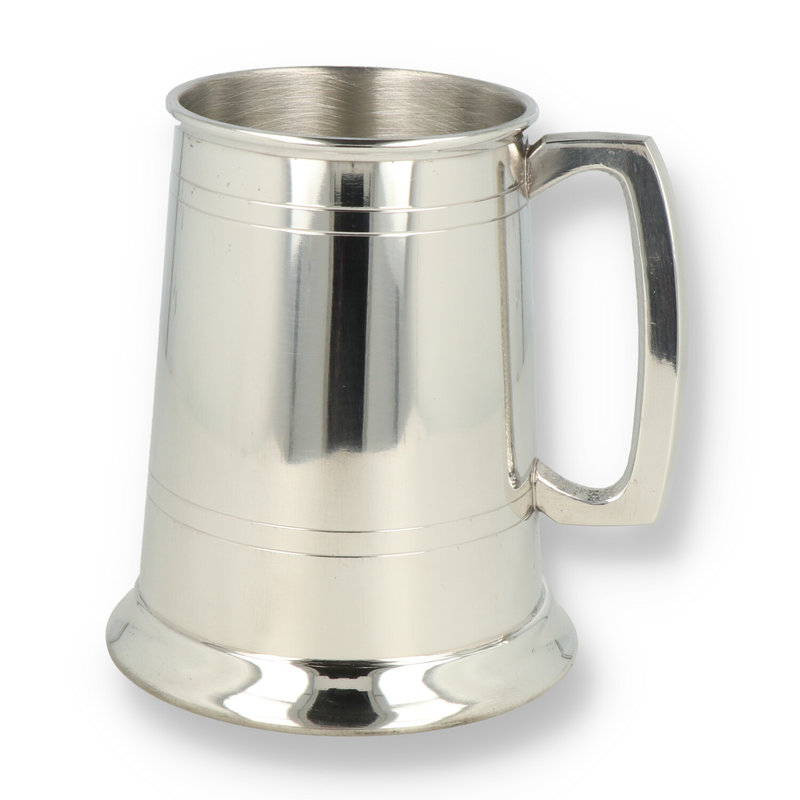 Nurled 1 Pint Tankard Pewter tankards are a great retro style gift to mark any special occasion, and the styling of this one pint tankard really feeds into this fact perfectly. The straight sided tankard has a highly polished finish to the body which is split by the inclusion of a knurled rope design in the middle, which stretches around the whole body of this tankard. This feature combines beautifully with the ornate Georgian style handle to give the tankard a historic feel as well as being aesthetically pleasing. Manufactured according to methods which are drawn from generations of craftsmanship experience within the pewter industry.