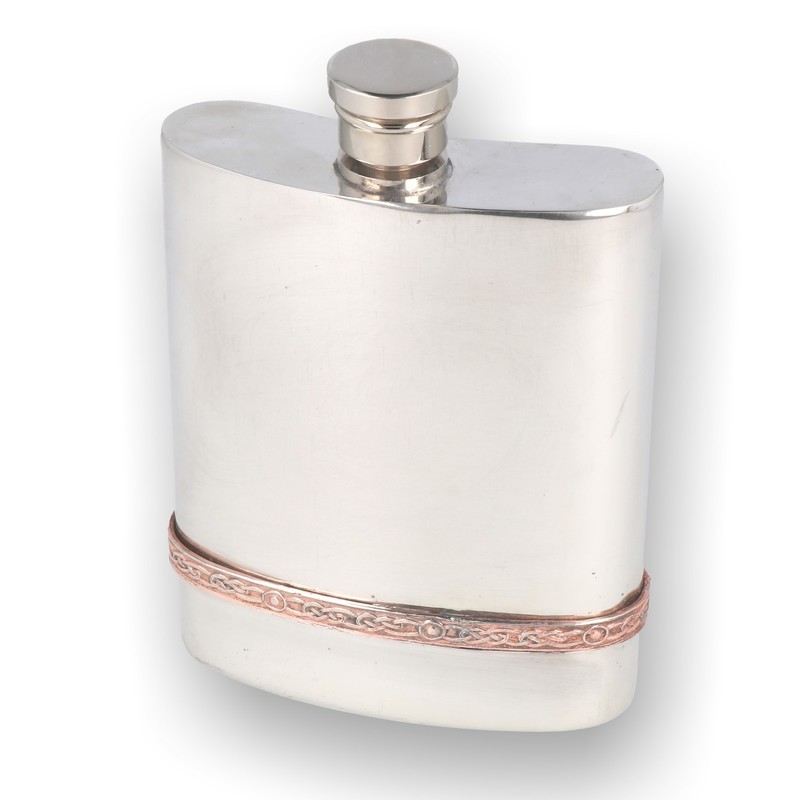 Hip Flask Manufactured using only the highest quality lead free pewter, the flask will not tarnish over time and is also perfectly placed to have your own choice of engraving added to make the gift truly unique. This particular flask is beautifully decorated by an intricate Celtic copper band which stretches across the bottom of the flask, and gives it something a little bit extra to help it stand out from the crowd. Supplied in an elegant cream and black presentation box and funnel this stylish hip flask is sure to be well received by your loved one on any occasion