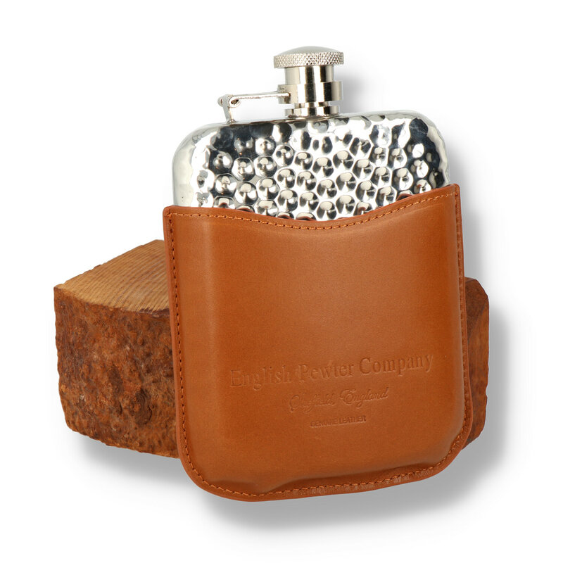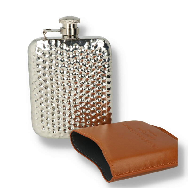 Hip Flask It is often the case that the traditional is still the best, and that argument can definitely be made about this simple and elegant pewter hip flask. Lovingly manufactured from the highest quality lead free pewter, this flask will stand the test of time without tarnishing. The plain body of the flask has a unique hammered finish, and the simplicity and utility of the flask is completed by the captive top that is attached to the flask via a hinged arrangement and is also supplied with a cream and black presentation box and funnel.