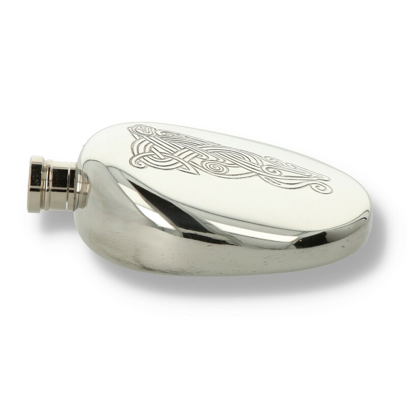 Mannanan Wedge Hip Flask A stylish, elegant wedge shaped hip flask, also known as a sporran style hip flask, is the perfect gift for any occasion. This pewter flask with a high polished finish and an intricately carved representation of the Celtic "Son of the Sea" Mannanan. It holds up to 6oz of your favourite tipple and is supplied with black presentation box and funnel.