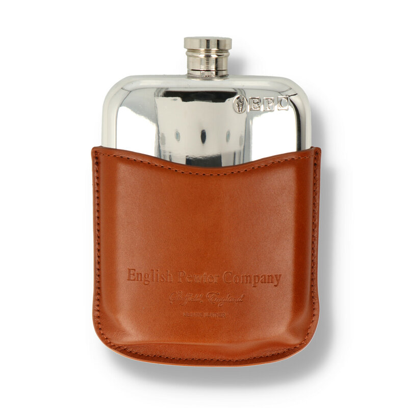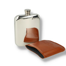 Hip Flask It is often the case that the traditional is still the best, and that argument can definitely be made about this simple and elegant pewter hip flask. This fabulous gift is lovingly manufactured from the highest quality lead free pewter, this flask will stand the test of time without tarnishing and the high quality tan leather pouch will keep the flask safe and adds an extra elegance to this beautiful hip flask. The plain body of the flask has a highly polished mirror-like finish, which is perfect for the addition of your own choice of engraving, and the simplicity and utility of the flask is completed by the captive top that is attached to the flask via a hinged arrangement and is also supplied with a cream and black presentation box, a filling funnel.