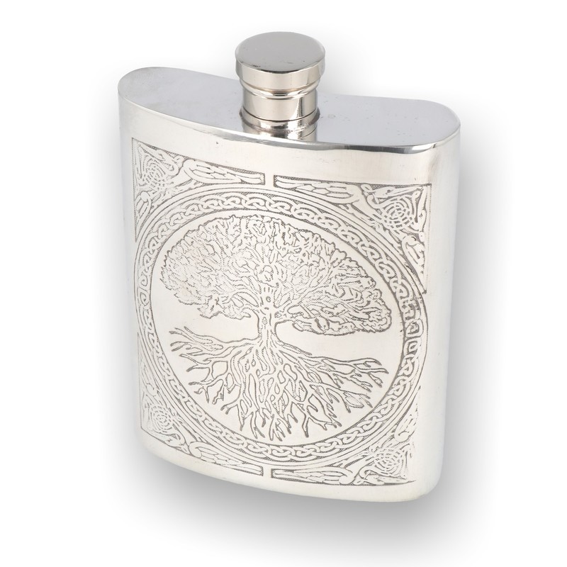Hip Flask This wonderful six ounce pewter hip flask has to rank amongst the most stylish and beautiful of the English Pewter Company range, and truly is a wonderful gift for a loved one to mark a landmark birthday or special occasion. The 12cm by 9cm pewter flask boasts an intricate and enchanting tree of life Celtic design which covers the front of the flask and contrasts wonderfully with the highly polished finish of the pewter. The gorgeous gift will not rust or tarnish over time and really is the perfect example of beautiful design and craftsmanship coming together and is also supplied with a cream and black presentation box and funnel.