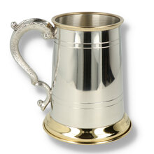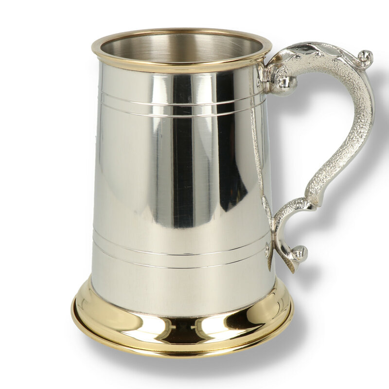 Straight Polished Pewter Tankard Sometimes trying to be too clever and intricate can be counter-productive, and keeping things simple is often a better course of action, as evidenced by this beautiful one pint pewter tankard.. This tankard has a highly polished straight, plain body that creates an elegant and stylish effect when twinned with the ornate Georgian style handle. Composed of pewter, the 4th most precious metal in common usage, and with a brass lip and base, the tankard will not tarnish and makes an ideal gift that will endure for years to come.. The 13cm tall and 8cm wide tankard has oodles of room for our outstanding engravers to add your own individual dedication or message, and will arrive with you in a black presentation box.