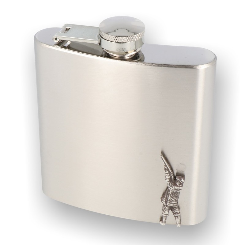 Hip Flask A stylish, simple hip flask, this stainless steel hip flask is the perfect gift for any occasion. This flask features a stylish hand cast pewter shooting badge, and is part of the popular country living Collection. This beautiful hipflask is supplied complete with black presentation box and funnel.