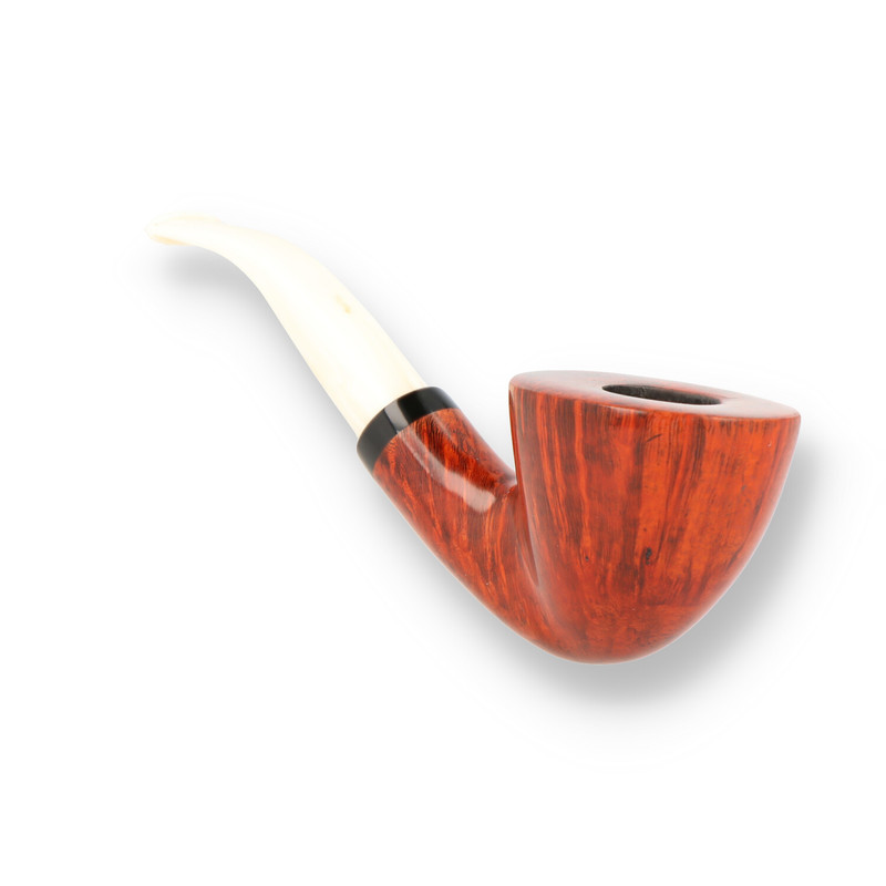 Nording Royal Flush: All of Erik Nording's pipes are works of art, and when art and functionality come together, you know you have something that is more than a sum of its parts. The Royal Flush pipes are no exception to this. The range has 6 unique and beautiful shapes cut across 5 different groups, Jack, Queen, King, Ace and Joker. To make each pipe unique Erik works with many different colours, finishes, bands and different interchangeable mouthpieces. This Ace 9mm is an jauntily angled horn shape with a stunning high gloss finish on the stunning flame grain with light stain. The pipe has a unique cream saddle style stem and black band.